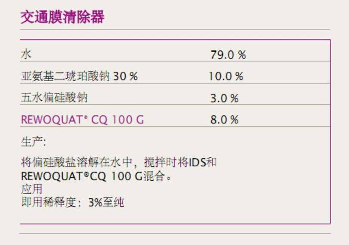 REWOQUAT®CQ 100 G对有机土壤的**清洁能力意味着它通常可以取代溶剂或溶剂型清洁剂,如油性残留物含有烟灰或颜料.