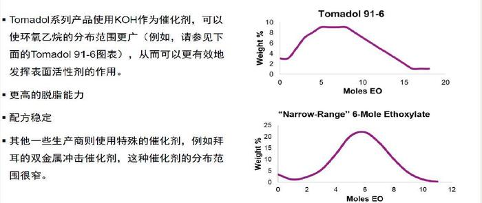 ▪ 由于使用特殊的生产工艺,EO分布范围广,决定其区别于其他91-6,天生拥有更强的脱脂和去污能力